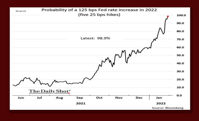 The FOMC made it clear on Wednesday, 2-2, (as clear as they make anything) that rate hikes are imminent. Chairman Powell projected a hawkish tone in his post-meeting press conference leaving open the possibility of several sequential rate hikes this year. A 125 bps (basis points) total rate increase this year (five 25 bps hikes) is now almost a certainty, according to the fed funds futures market. (See chart , 1-31-22)