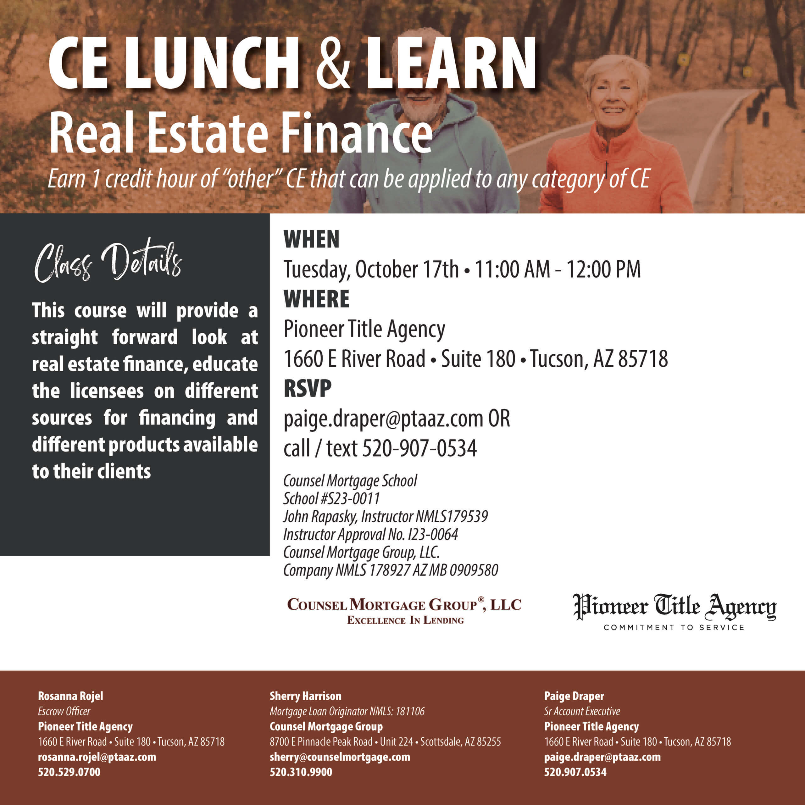 Join us Oct. 17th at 11 am at Pioneer Title Agency in Tucson, AZ for a free ADRE continuing education hour. I will be presenting a class on real estate finance, similar to the class I presented at the State Bar this summer. We will go over the different types of loans available, while sharing my experience and tricks of the trade I’ve learned over the years. There are so many products available today and ways to get your clients approved. RSVP to Pioneer Title. Looking forward to seeing you there!