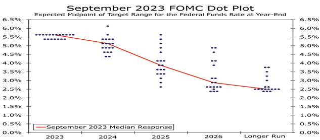 But how high, and for how long? Some insight can be gained from the Dot Plot (chart below) of individual Committee members. The chart shows that we can be expected to finish 2023 about where we are, although the likelihood of another 25 b.p. hike in November is still in the cards. Policy makers reduced the number of anticipated rate cuts next year from four to two, resulting in a fed funds projection of 5.1% at the end of 2024.