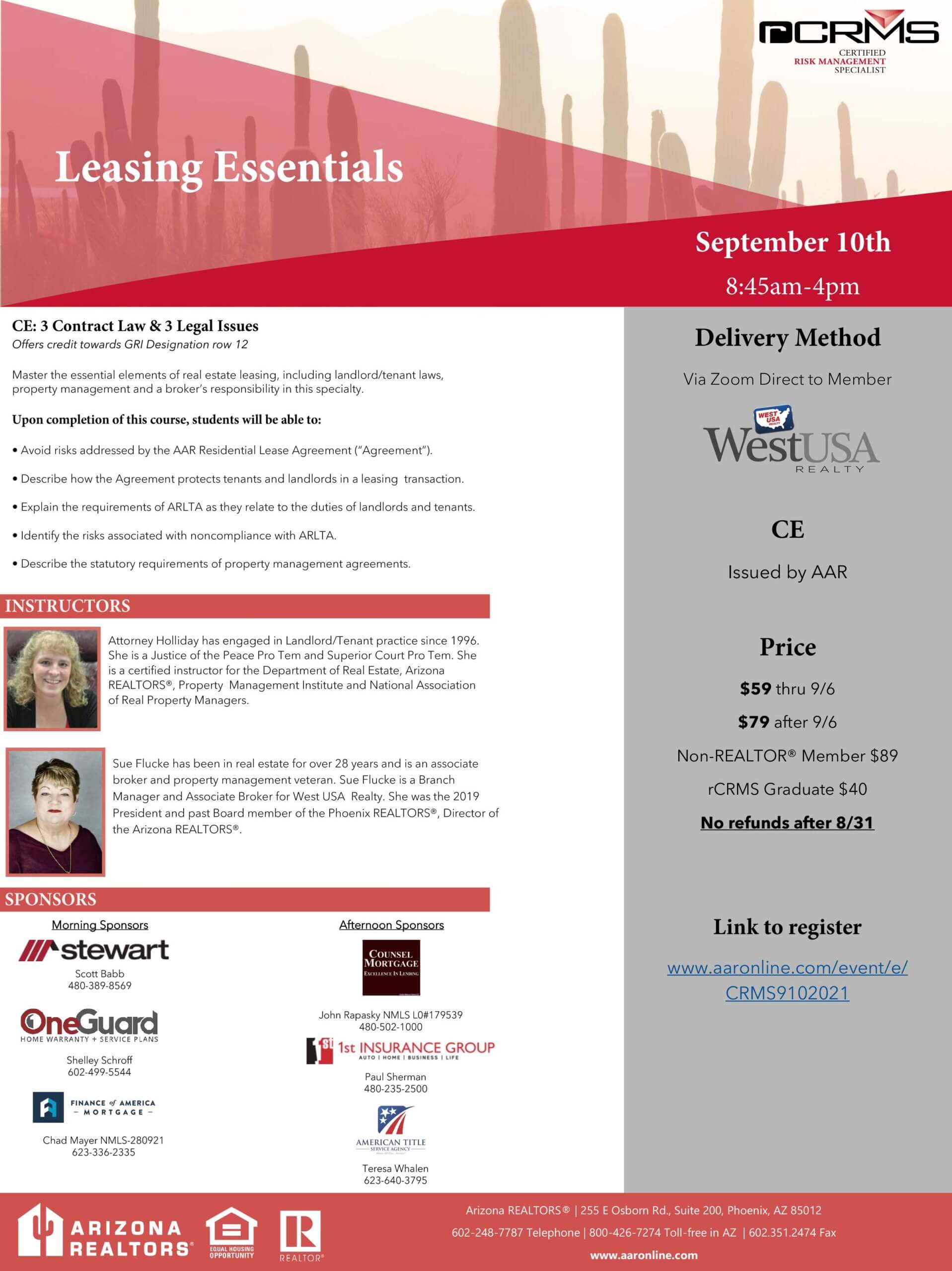 The course offers 3 Contract Law, 3 Legal Issues and GRI Designation credits. Come learn to master the essential elements of real estate leasing, including landlord/tenant laws, property management and a broker’s responsibility in this specialty.